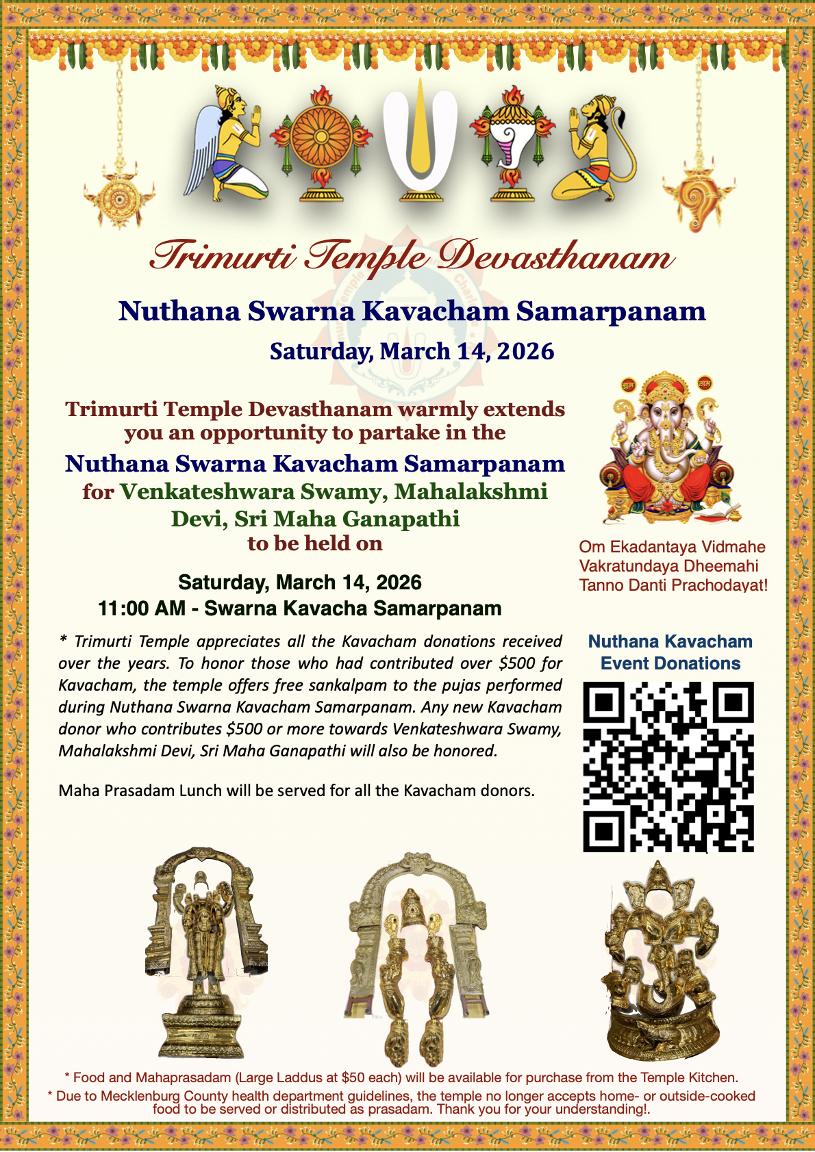 | Saturday | 14 | 11:00 AM | Nuthana Swarna Kavacham Samarpanam (Sri Venkateshwara, Sri Mahalakshmi, Sri Ganesha) * |