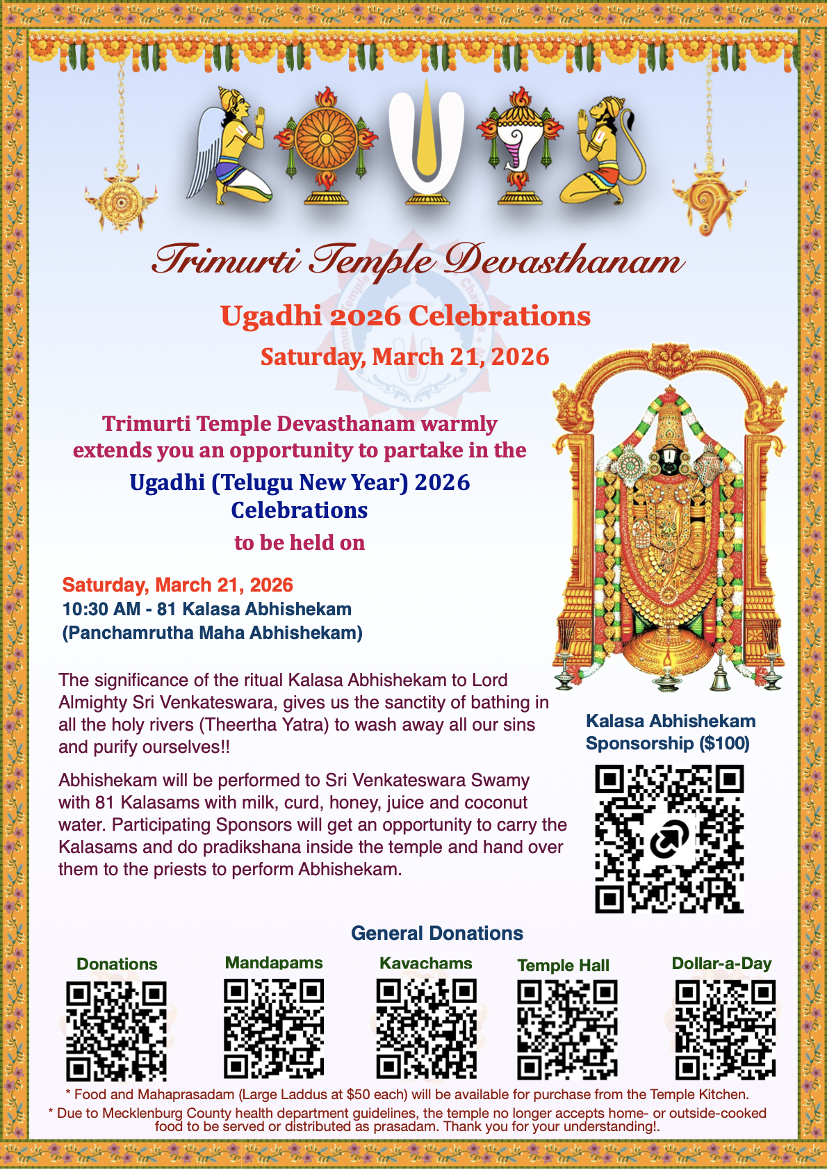 | Saturday | 21 | 10:30 AM | Ugadhi Celebrations (81 Kalasa Abhishekam for Sri Venkateshwara) * |
