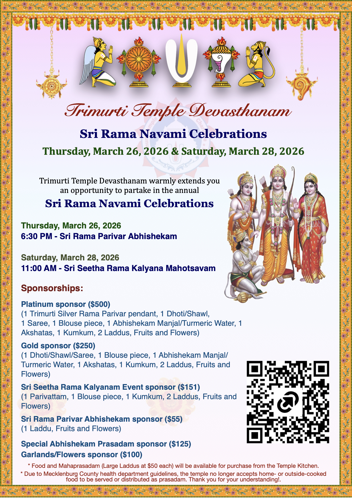 | Thursday | 26 | 6:30 PM | Sri Rama Navami (Sri Rama Parivar Abhishekam) * |