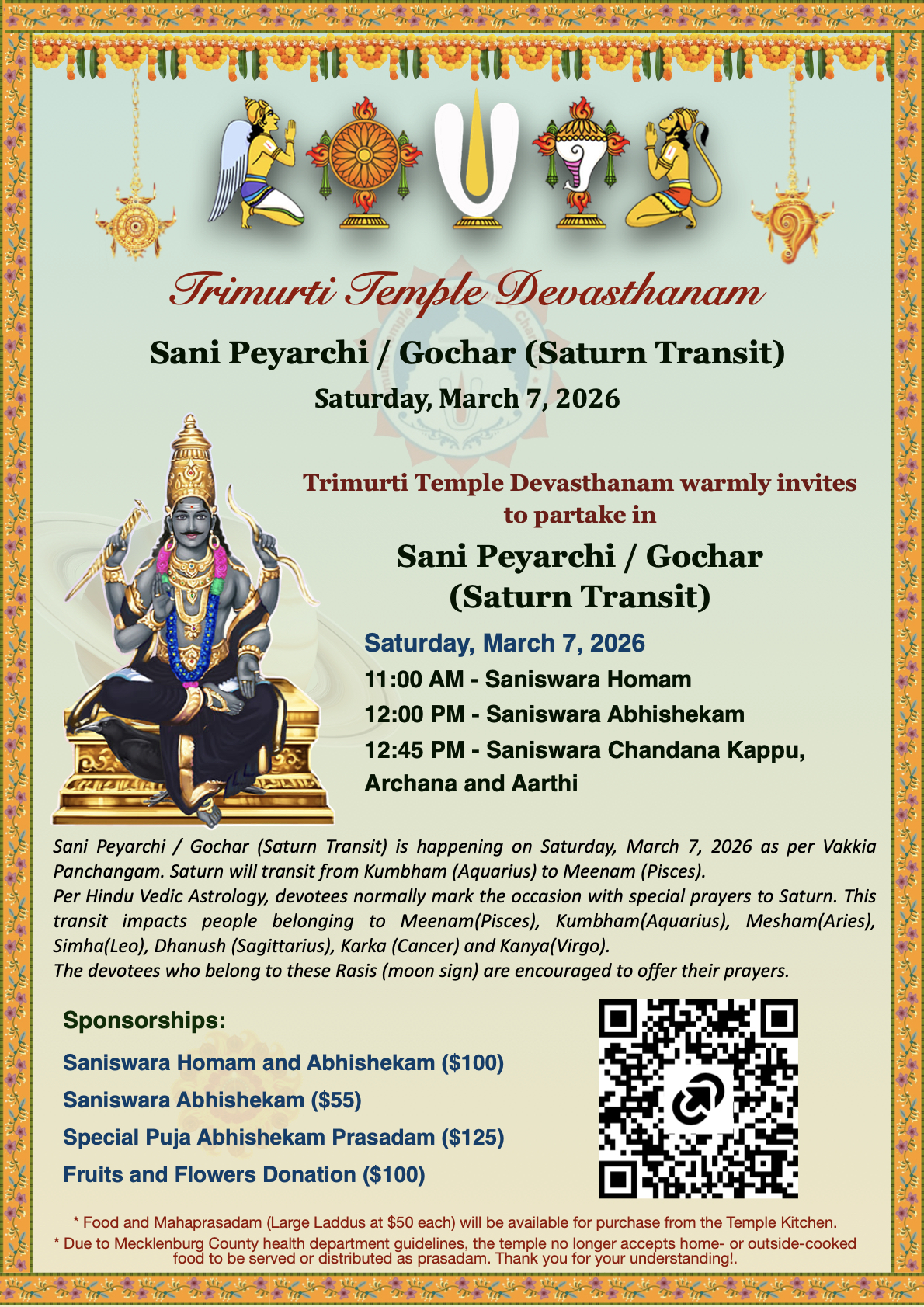 | Saturday | 7 | 11:00 AM | Sani Peyarchi / Gochar (Saturn Transit) (Saniswara Homam & Saniswara Abhishekam) * |